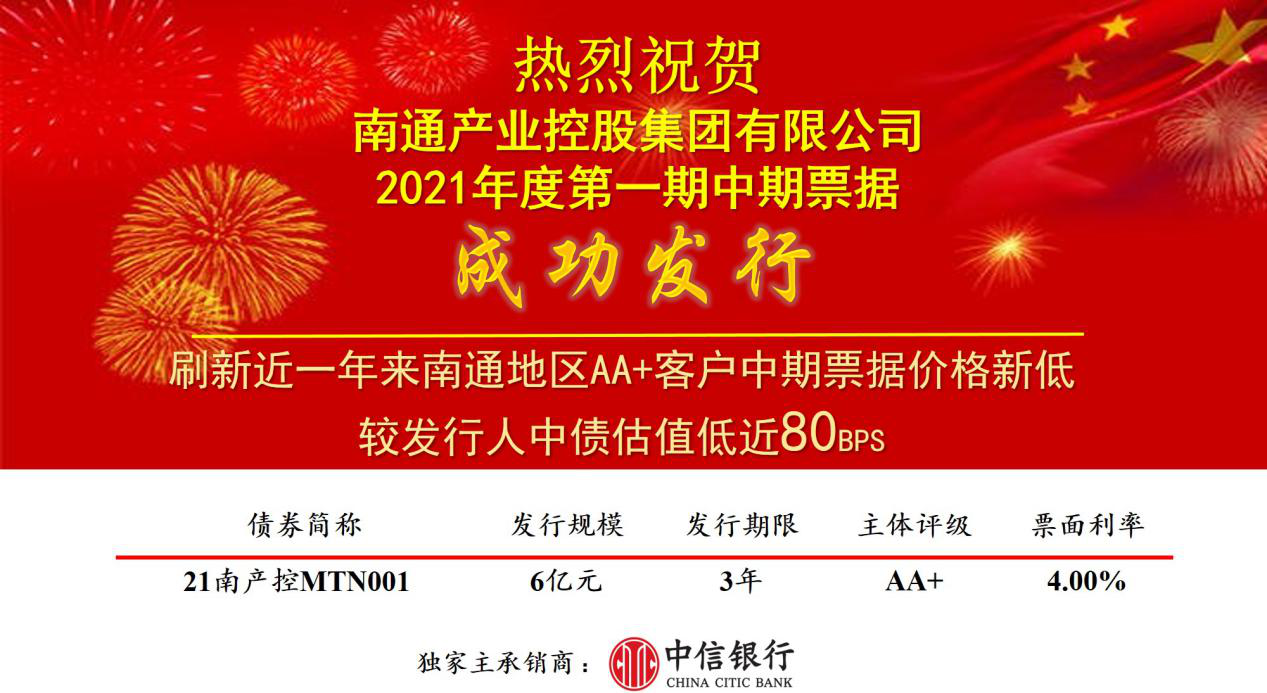 2021年422,產(chǎn)控集團(tuán)成功發(fā)行6億元中期票據(jù)。由于產(chǎn)控集團(tuán)的良好資質(zhì)得到投資者的認(rèn)可,本期中票簿記倍數(shù)1.6,邊際倍數(shù)1.16倍,票面利率4%,比集團(tuán)三年期債券估值近80BPS,同時創(chuàng)下了近一年來南通地區(qū)AA+評級中期票據(jù)價格新低